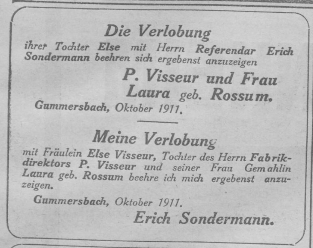 Erich Sondermann heiratete am 28. April 1913 in Gummersbach Else Visseur. Else Visseur wurde am 1. Oktober 1886 als Tochter des Peter Otto Visseur und der Laura Margareta Rossum in Gummersbach geboren. Peter Visseur war Farbikdirektor bei L. & C. Steimüller und Träger des Roten Adlerordens IV. Klasse. [6] Das Paar hatte sich bereits im Oktober 1911 verlobt. [7]