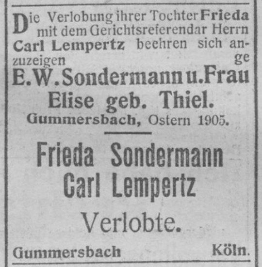 Frieda Sondermann verlobte sich im April 1905 mit Carl Lempertz aus Köln. [3]