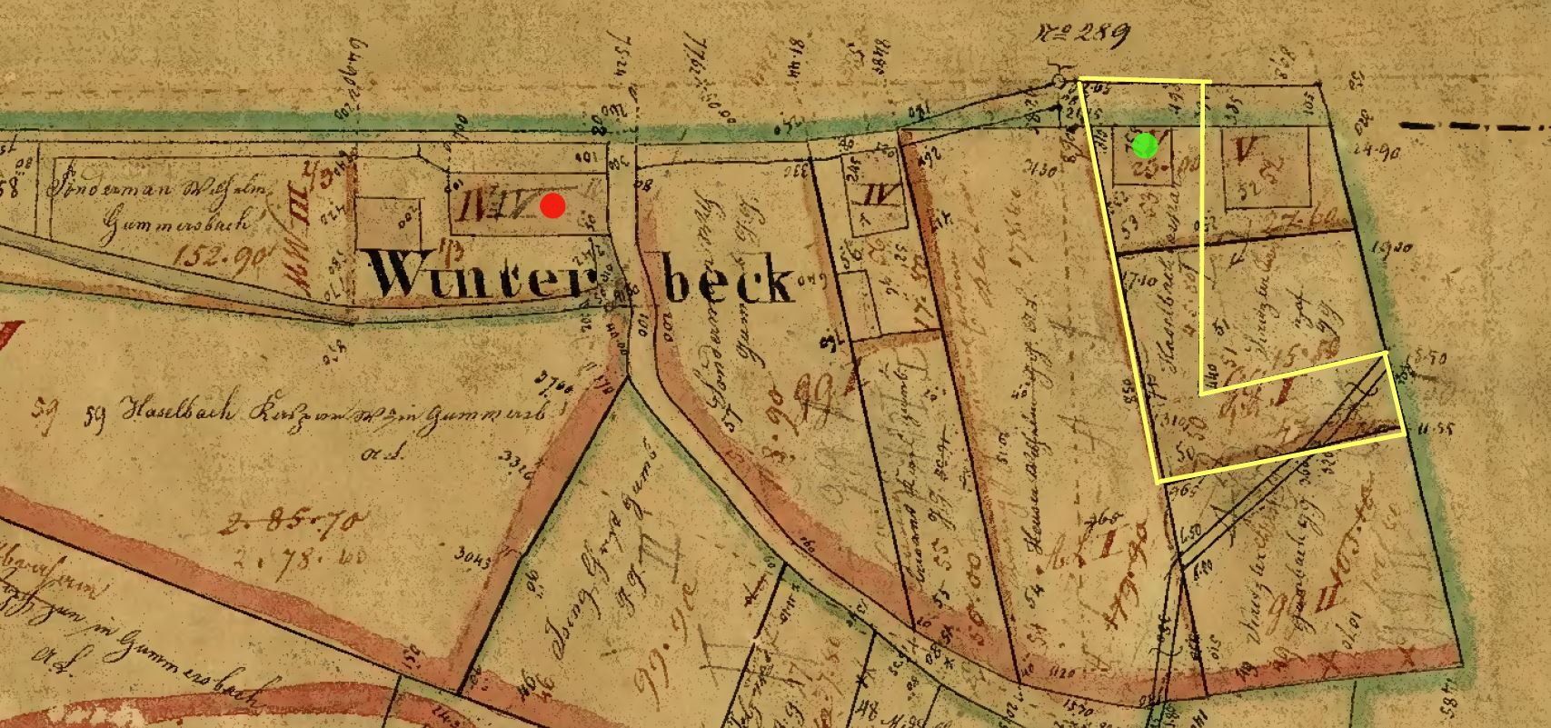 Ein bebautes Grundstück der Haselbachs (wahrscheinlich dasjenige, über das Amalie Müller-Thiel berichtet) grenzte an den Besitz der Sondermanns wie aus einer Bekanntmachung zur Erbteilung der Haselbachs aus dem Jahr 1847 hervorgeht [6]. Darin wird erwähnt: "Flur 6, Nro. 53 in der Winterbecke, 23 Ruthen Gebäudelage und Hofraum nebst dem darauf stehenden mit Nro. 293 bezeichneten Hause und Flur 6, Nro. 50 daselbst, 45 Ruthen, 80 Fuß Garten, neben Christian Kritzler und Wilhelm Sondermann." [7] Auf nachfolgendem Auszug der Urkarte Gummersbachs sind die Grundstücke markiert [7a]: