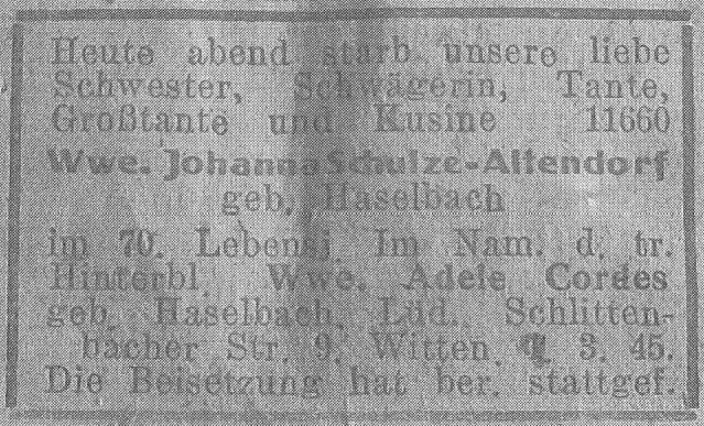 Johanna Haselbach heiratete in Witten am 10. November 1903 Friedrich (Fritz) Schulze-Altendorf. [3] Fritz Schulze-Altendorf wurde in Altendorf