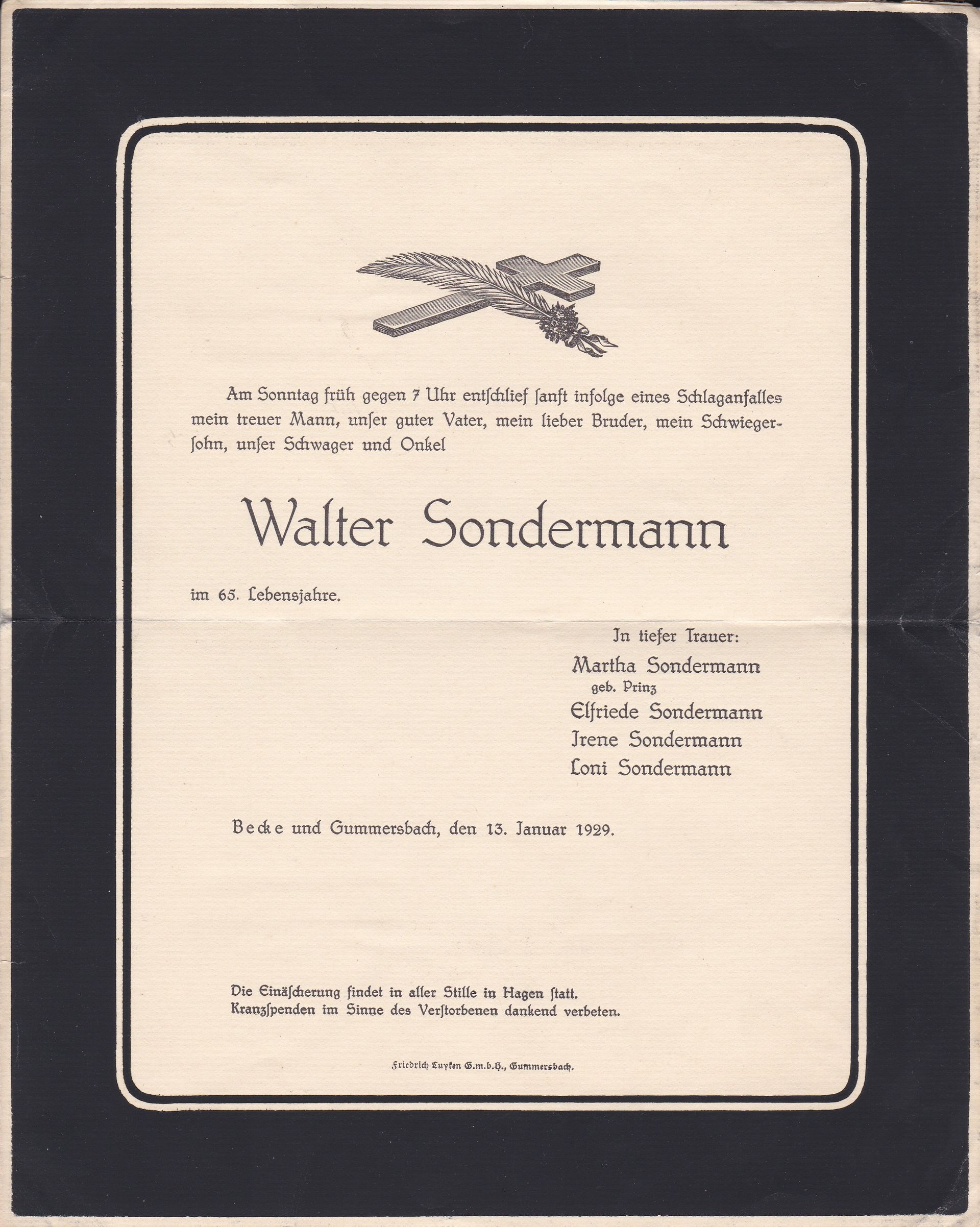 Walter Sondermann verstarb in Gummersbach am 13. Januar 1929 an einem Schlaganfall bzw. Hirnschlag. [27] Zu seinem Lebensende wird von seiner Enkelin berichtet: "Den ersten Schlaganfall hatte er vor der Bank in Gummersbach. Dort ist er auf der Straße umgefallen. (Er soll die Löhne geholt haben) und hatte seinen Hund dabei. Man wollte ihm helfen, aber der Hund ließ keinen an Walter Sondermann herankommen. Seine Tochter wurde aus der Schule geholt. Sie sollte den Hund besänftigen, sodass man Walter helfen konnte. Danach hatte er weitere Hirnschläge, woran er dann auch gestorben ist." [28]