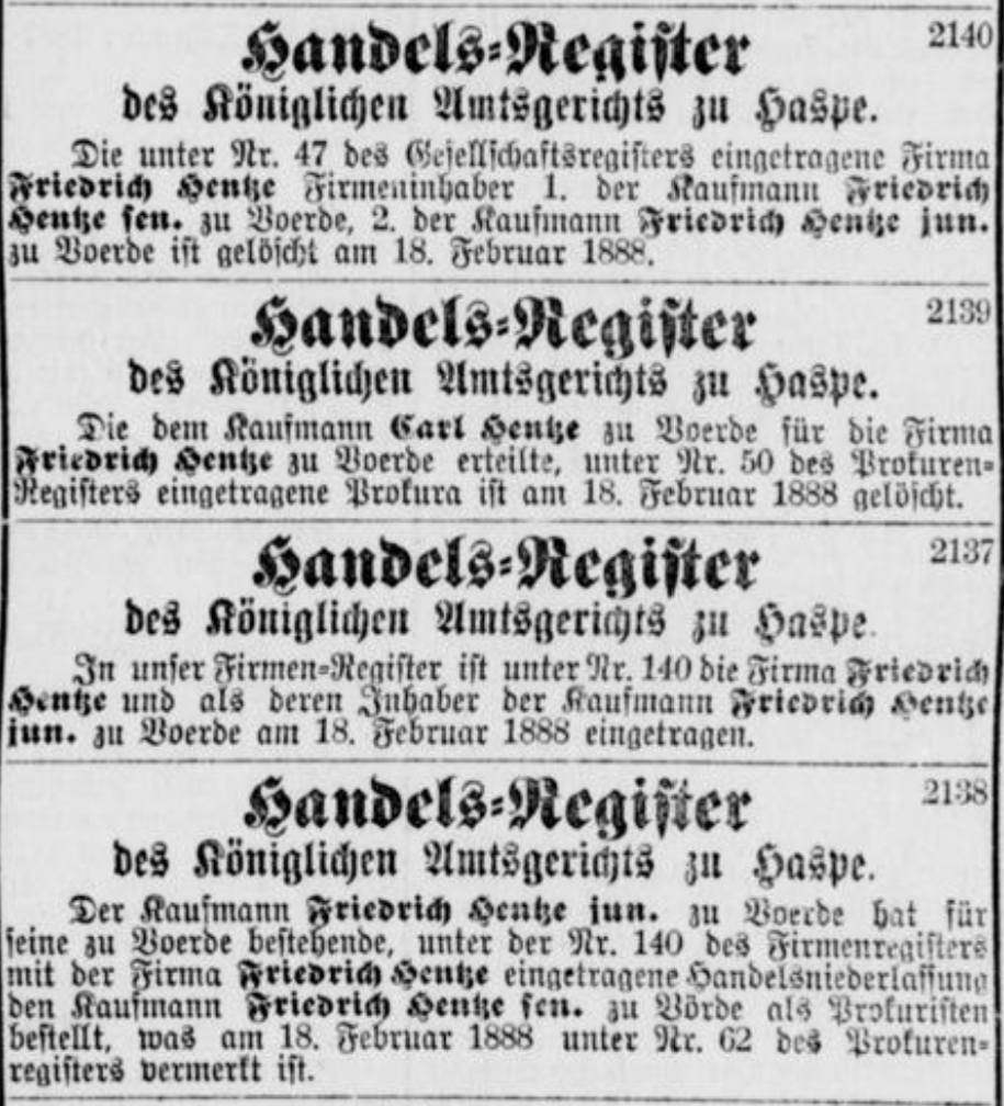 Friedrich Hentze junior wurde im Februar 1888 Alleingesellschafter. Für seinen Vater Friedrich Hentze senior wurde Prokura erteilt und die Prokura für Carl Hentze gelöscht. [26]