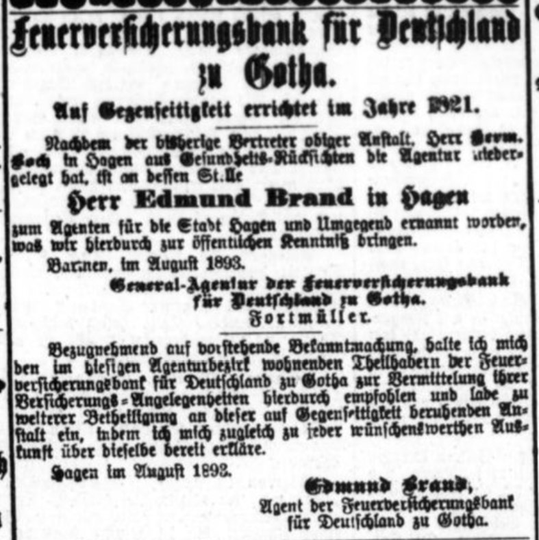 Seit 1893 bis zu seinem frühen Tod im Jahr 1901 war Friedrich Hentze Vertreter der Feuerversicherungsbank für Deutschland zu Gotha. [33]