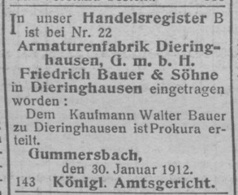 [11] Vgl. Königliches Amtsgericht Gummersbach (1912): Bestellung des Walter Bauer zum Geschäftsführer, in: Kölnische Zeitung 1912, Nr. 973, Zweite Morgen-Ausgabe, S. 3.