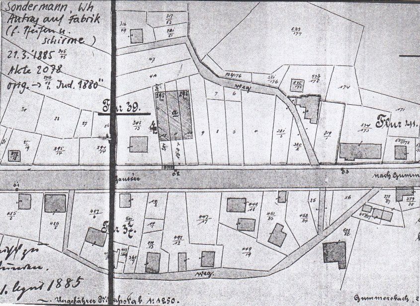 So beantragt Wilhelm Sondermann wenige Jahre nach dem Tod seines Vater Franz Carl Albert Sondermann am 21. März 1885 den Bau einer Fabrik für Pfeifen(-schläuche) und Schirme unmittelbar neben seinem im Jahr 1877 errichteten Wohnhaus [16]. Der Grundriss des Bauantrags ist unten abgebildet. Die Fabrik ist das große Gebäude im Zentrum der Abbildung. Das kleine Quadrat links daneben ist der Grundriss des Wohnhauses des Wilhelm Sondermann. Der Bauntrag wurde noch 1885 genehmigt [17].